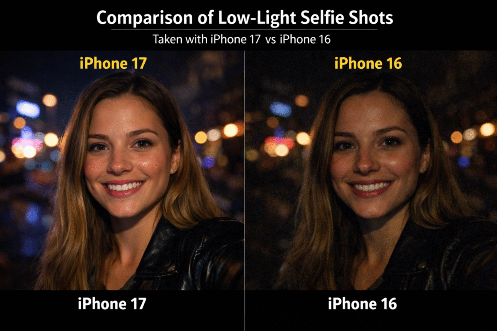 The iPhone 17 features a new 24MP selfie camera, doubling the resolution of the iPhone 16’s 12MP shooter. It’s not just about megapixels; the detail in Facetime calls and selfies is striking. In low light, the difference is night and day. The iPhone 17 captures sharp, well-lit selfies in dim bars or evening streets where the iPhone 16 would often produce grainy, soft images.